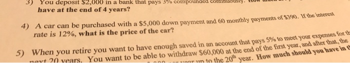 20% down payment on the car and financed the remaining cost of the car for 5 years at 6.5%. How much interest did Noah pay on his car loan? _____ 13. Mr. Silva earned $196.50 in interest in a year for an account the money for a car. They will loan her $5,000 for 5 years at 5% simple ... Read Here